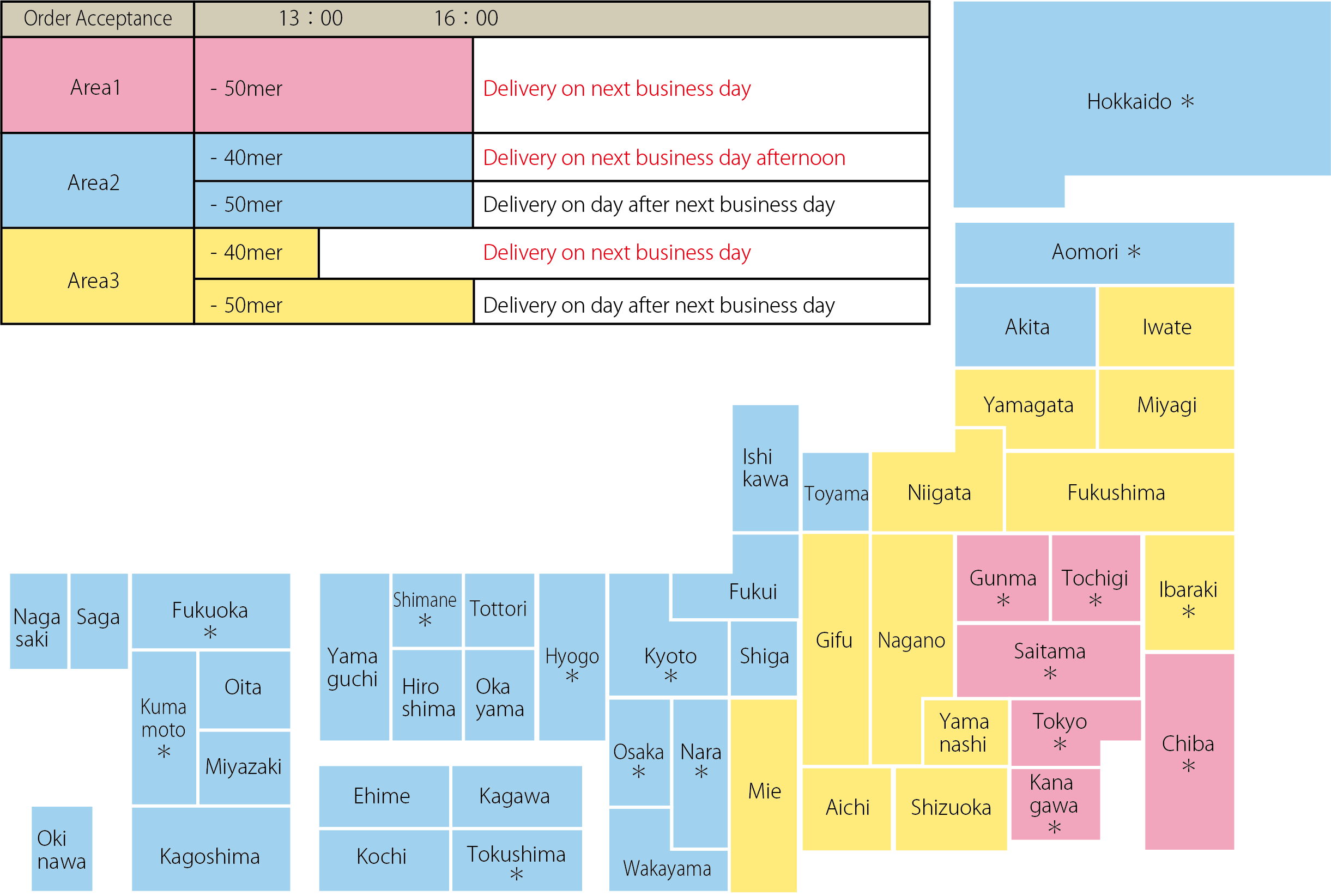 For regions marked with an asterisk (*) , the delivery area may differ from the map classification depending on the destination address.