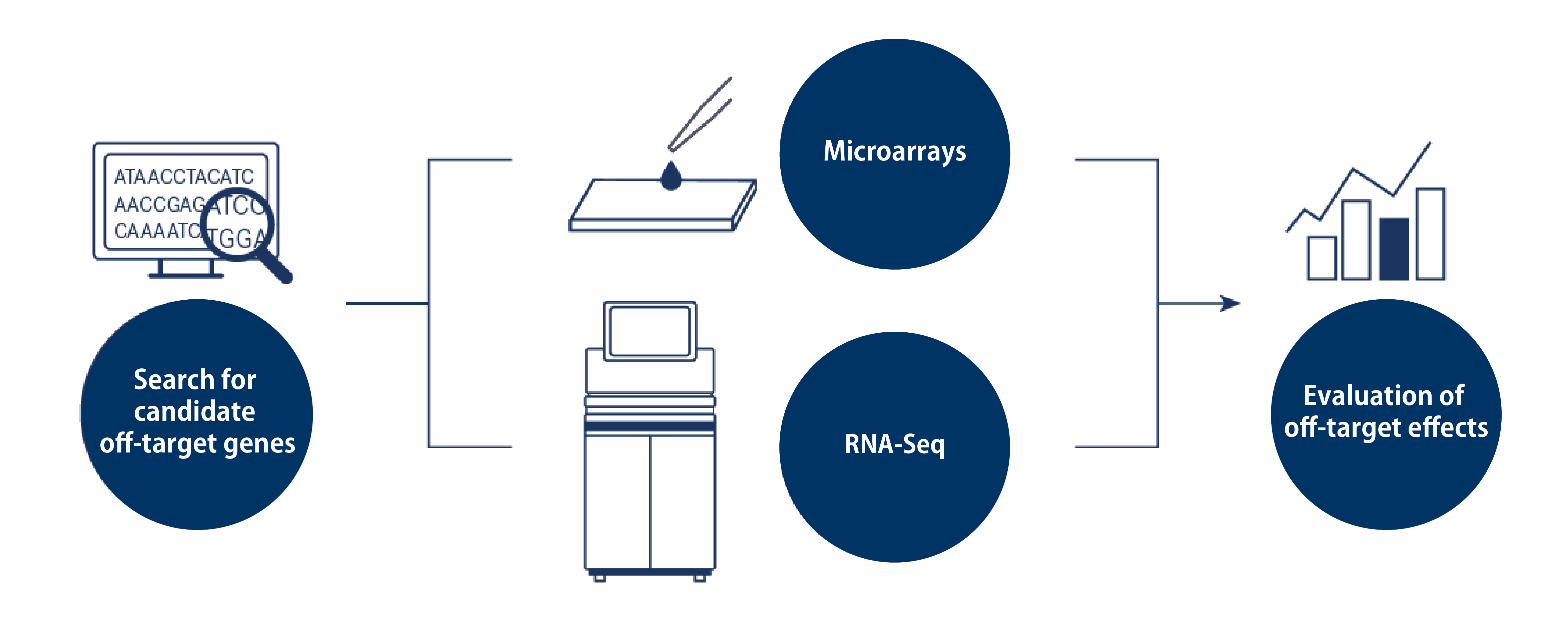 Using a dedicated sequence search tool*, we identify candidate genes that are likely to be affected as off-targets based on the sequence information you provide.