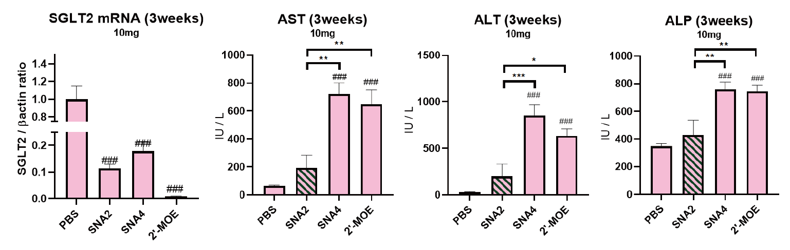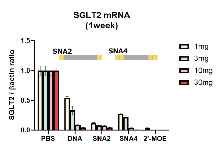 SGLT2を標的とした12merのギャップマー型アンチセンス(2-8-2, 1-10-1)にて、両末端にSNAやL-aTNAを配したものも、mRNAの発現抑制、タンパク発現抑制、尿糖排出が観察され、アンチセンス効果を発揮することが確認されました。さらに毒性評価の結果、特に肝毒性が低い傾向にあることを確認しました。
