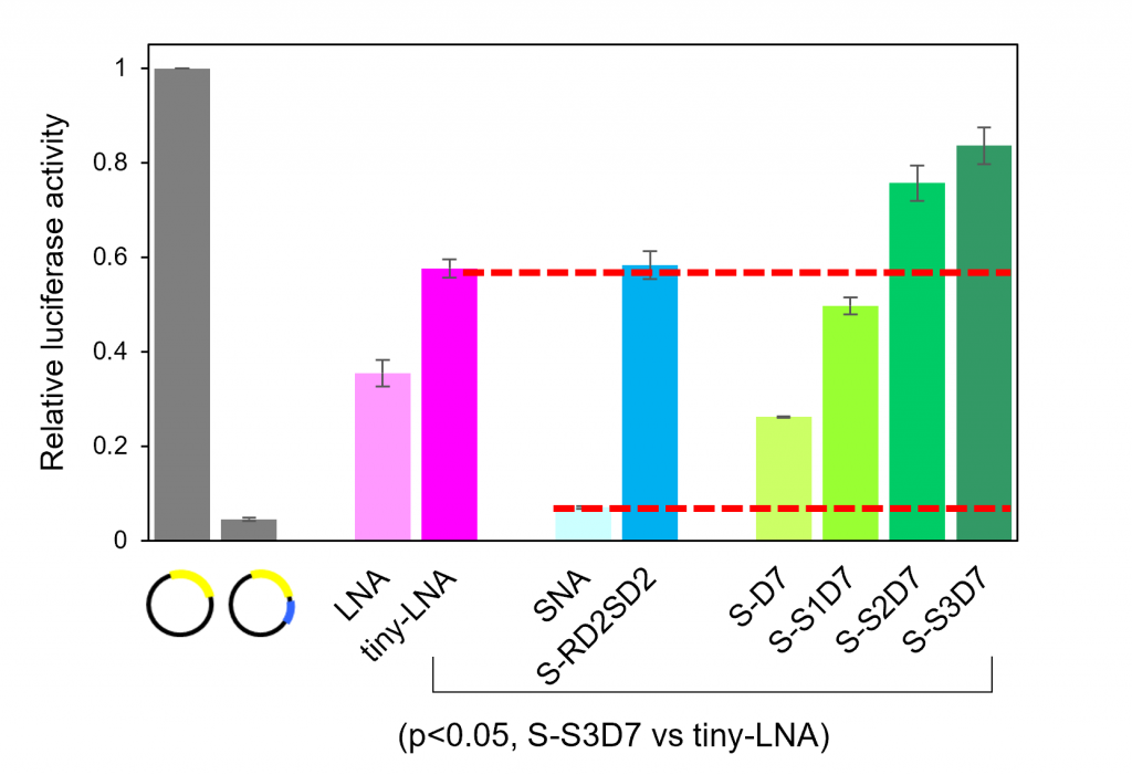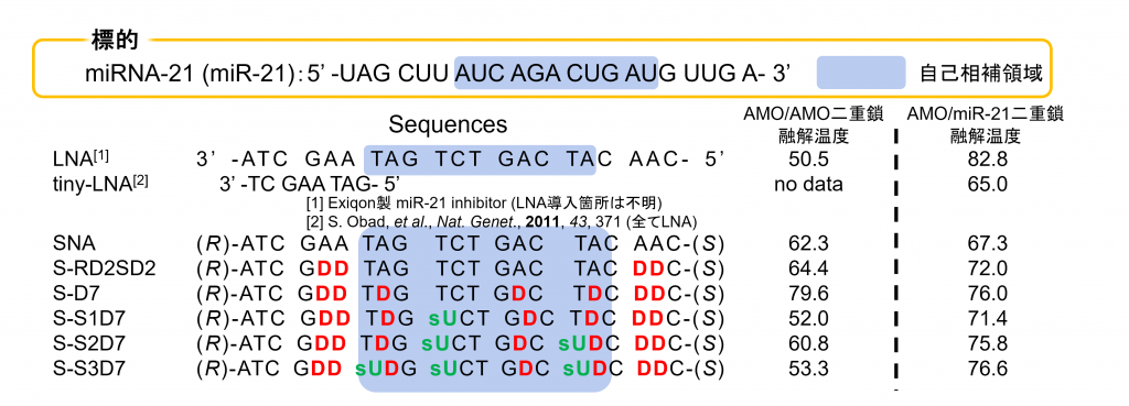 自己相補領域にあるAとUをそれぞれD、sUへ置換することで、自己相補性の抑制とターゲット親和性が向上し、置換数に応じて活性が上昇、従来市販されているAMOと比較して高活性なものが得られることが確認されました。