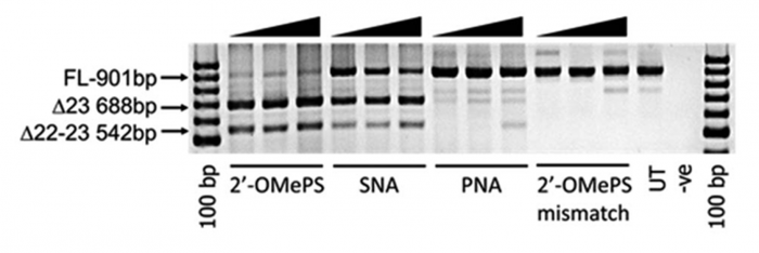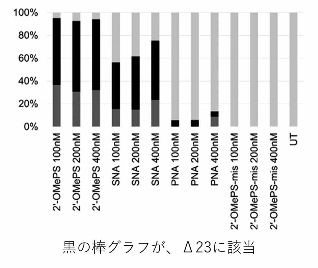 最近の研究から、アデニンをジアミノプリンに置換したアンチセンスはエクソンスキップ効果を増加させ、PS修飾により、エクソンスキップ効果をさらに増強させることがわかりました。