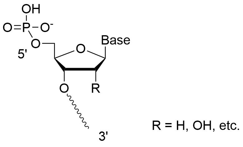 化学合成した未修飾オリゴ核酸は5’OHとなっています。5’Phosphateは、5′末端にリン酸基の導入が必要な場合に利用されます。