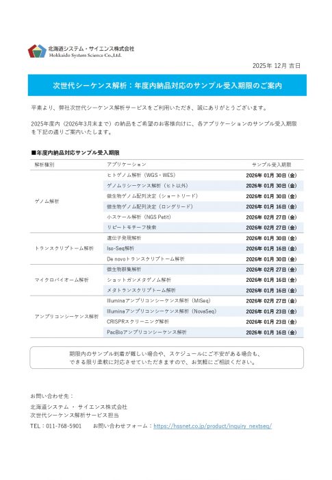次世代シーケンス・マイクロアレイ年度内納品サンプル受入期限のご案内